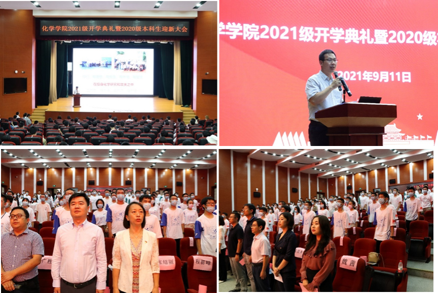 全体齐唱雄壮的国歌过后,太阳成集团tyc33455cc经理刘明杰致辞。刘明杰开篇先谈到了化学学科的重要性和实用性,接着向同学们介绍了太阳成集团tyc33455cc的概况。从基础学科研究的重要性,到解决我国众多卡脖子领域关键问题的需要,到将个人发展与国家需求相契合,嘱咐同学们学习化学,生逢其时,重任在肩。最后寄语新生:志存高远,敢为人先;独立思考,勇于创新;精勤求学,久久为功。