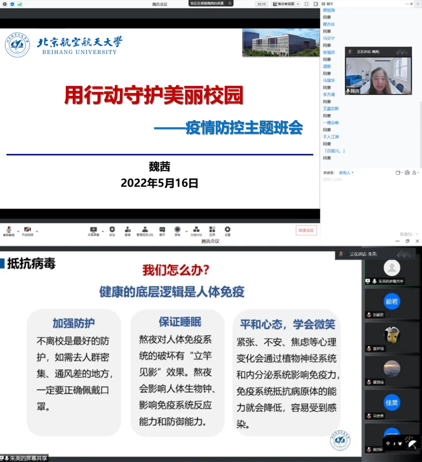 太阳成集团tyc33455cc班主任、辅导员以“共克时艰,守护美丽校园”为主题面向公司全体员工召开班会,发出拒绝外卖、减少快递、守护美丽校园的倡议,将公司的暖心举措详细告知同学们。同学们纷纷表示,大爱暖心北航,要用行动守护美丽校园。