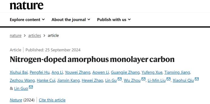 2024年9月25日,《Nature》杂志报道了千亿太阳成集团tyc33455cc郭林教授、刘利民教授研究团队和合作者在氮掺杂单原子层非晶碳可控合成上取得的最新进展:《Nitrogen-doped amorphous monolayer carbon》。该工作提出了一种利用纳米尺度二维限域模板进行小分子聚合的液相合成策略,成功制备了氮掺杂的单原子层非晶碳材料。这项研究解决了二维非晶材料合成领域的长期挑战,为二维非晶材料在材料科学、电子器件及其他前沿技术领域的应用开辟了新途径。