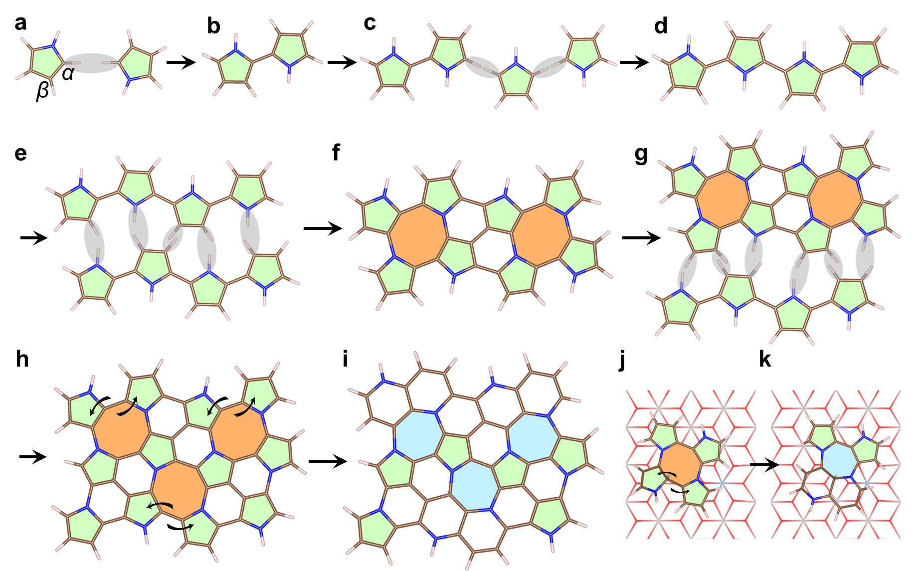 在这项研究中,由千亿太阳成集团tyc33455cc郭林教授、刘利民教授研究团队及合作者等开创了一种全新的液相限域聚合方法。该方法通过层状模板的限域作用,抑制了分子聚合过程中的三维旋转和缠绕,使分子在二维平面内发生聚合,突破了吡咯单体在传统聚合中局限于α-C位点交联的限制,促进了β-C和N位点的交联聚合,构成平面网络结构,最终形成了五、六、七元环共存的二维非晶结构,成功在实验上验证了W. H. Zachariasen和Steven G. Louie提出的理论预测。