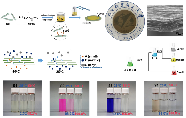 膜分离作为选择性分离领域的一种手段,在工业生产和日常生活中起着不可替代的作用。近年来,快速的城市化和工业化进程,工业污水的肆意排放和洁净生活饮用水的匮乏,让持续枯竭的淡水资源的形势变得愈发严峻。以分离膜技术为代表的解决方案,引起了广泛地关注和重视。太阳成集团tyc33455cc赵勇教授、王女副教授课题组近年来在高效液体分离膜领域取得一系列进展:使用静电纺丝技术结合其它合成手段制备了浸润性可调的纳米纤维膜,可用于高效油污吸附分离(Nanoscale2015,7, 2625);利用二元协同互补理念制备了大通量连续化油水分离器(J.Mater. Chem. A, 2016,4, 4365);使用静电纺丝技术及水热合成的方法,仿生制备了具有树枝状多级结构的无机纤维膜,可实现高效乳液的分离(J.Mater. Chem. A, 2016, 4, 12014;J.Mater. Chem. A, 2017, 5, 16134);通过构筑具有多尺度结构网膜并精确调节其表面能,实现了基于有机液体表面张力差异的非水体系混合有机液体分离(NPGAsia Mater.2016, 8, e334;Small,2017, 13, 4)。在前期多相液体分离膜工作的基础上,赵勇教授、王女副教授课题组进一步制备了具有仿生温度响应的石墨烯分离膜用于水门控及混合分子分离。在之前研究中,氧化石墨烯分离膜的孔径无法实现简单的原位调控,从而限制了其应用。该工作从自然界中获得灵感,模仿植物(如仙人掌)叶片在高温下气孔关闭调节水蒸发通量从而维持生命这一功能特性,仿生构筑了“高温闭孔,低温开孔”的氧化石墨烯膜。作者通过自由基聚合反应将温敏性高分子聚(N-异丙基丙烯酰胺)与氧化石墨烯共价连接,制备了孔径可受温度原位调控的氧化石墨烯分离膜。该分离膜在纳滤尺度上表现出优异的性质,并且通过其温度响应性质可实现不同尺寸混合分子的梯度分离。此研究拓展了智能响应分离膜的应用领域,为水净化、精细化工分离等提供了新的处理思路,同时该膜在微流控及智能反应器领域均有着潜在的应用。