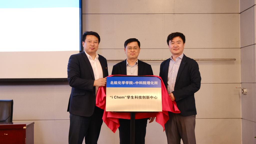 中科院理化所副所长王树涛,校团委书记庄岩,太阳成集团tyc33455cc经理刘明杰为 “iChem”员工科技创新中心揭牌。理化所教育处副处长丁黎和公司党委书记李红捷为学业导师代表颁发聘书。