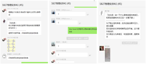 利用微信群翻转课堂来了解同学们对知识点的理解程度,以及对知识点的理解是否有偏差。每次课我们会准备10~20个与课程教学内容相关的问题进行科学设疑,提前发布,让同学们带着问题学习并回答。对于课程中的重点和难点问题,例如“如何利用化学势来推导理想液态混合物的性质?”、“溶剂和溶质的化学势表达式如何推导?”、“多组分体系的热力学基本关系式如何表达?”以及“热力学判据及适用条件”等,邀请同学们进行语音讲解或手写拍照来讨论,使同学们能够“讲得懂”所学到的知识点。