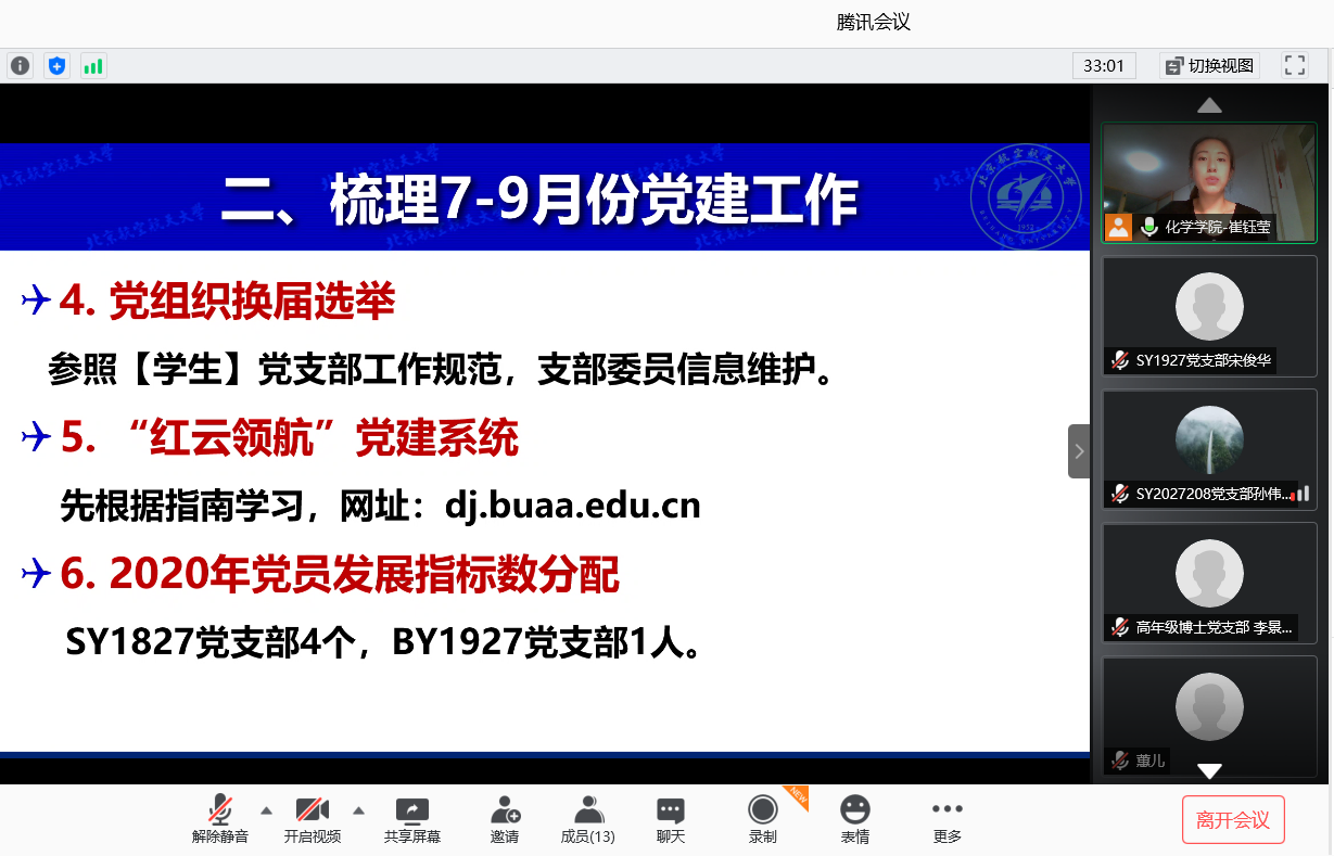 为进一步凝聚合力,扎实推进公司党建各项工作,确保圆满完成全年党建工作任务。2020年9月24日晚19:30,公司组织召开2020年秋季学期第一次支部书记联席会,公司副书记张绍丽、分团委书记魏茜,以及全体员工党支部书记参会。公司党务秘书崔钰莹老师主持线上会议。