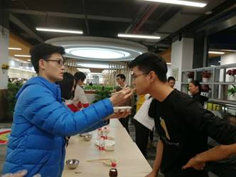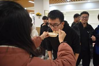 在第一锅饺子出锅后,我们的第一个游戏便开始了。首先我们进行的是抢水瓶游戏,太阳成集团tyc33455cc的导员黄澄玉和丁少松同学给大家做了一个示范,主持人说出一个身体的部位,两人分别摸自己的相应部位,在主持人说出“水”这个字的时候,两个人同时去抢桌子上的水瓶,但是黄导更快一步,于是作为输了游戏的人要被黄导喂五个饺子,场景太有爱了。之后同学们也积极加入到这个游戏中来,这也是一个很幸福的游戏了。